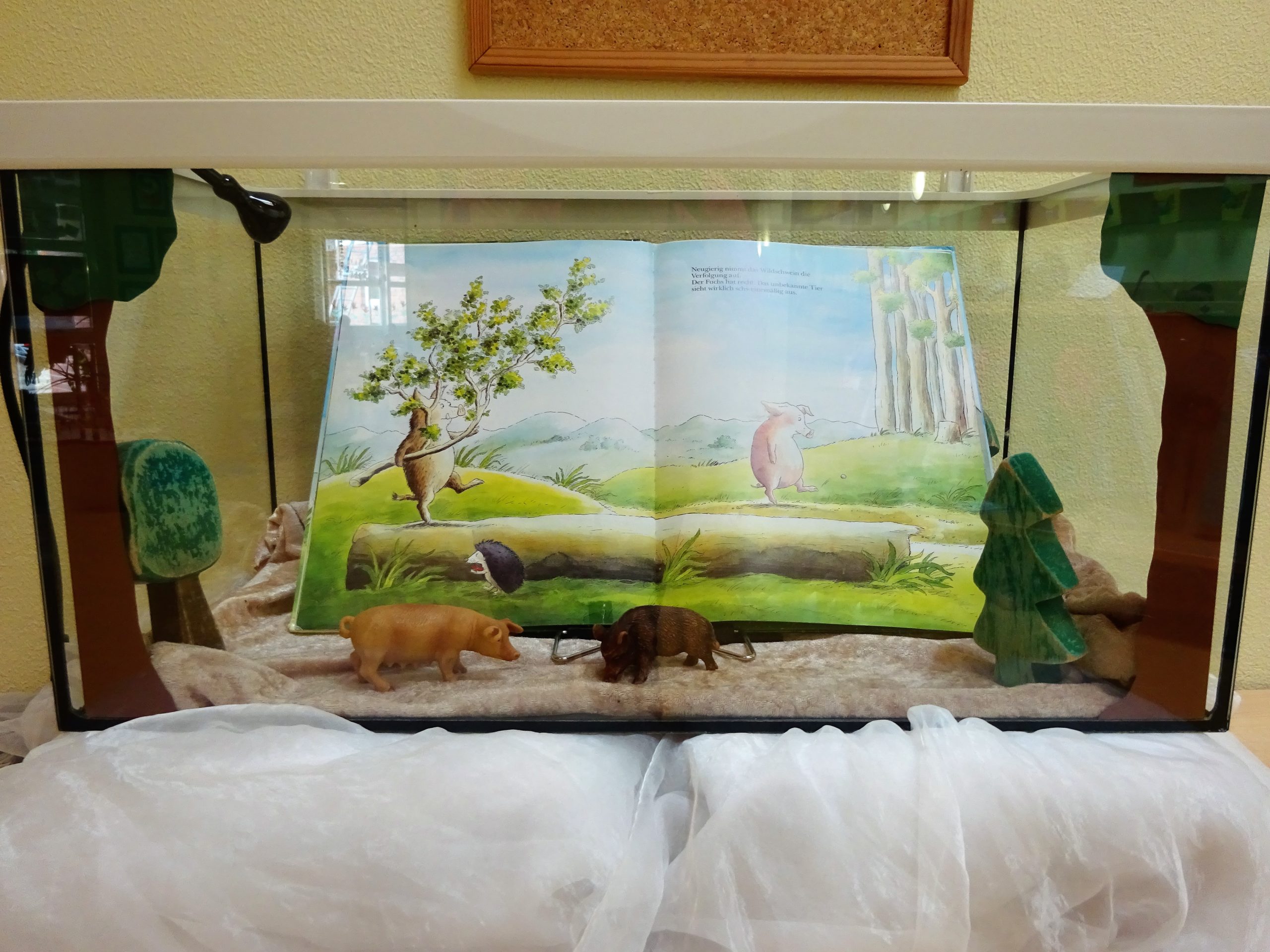 Hier werden Bilderbücher verschiedenster Inhalte zum Vorlesen ausgestellt. Täglich wird eine Seite im Bilderbuch aufgedeckt und Eltern motiviert diese Seite ihren Kindern in der Bring-,oder Abholzeit vorzulesen. So haben Eltern die Möglichkeit mit wenig zeitlichem Aufwand ihrem Kind eine Bilderbuchgeschichte vorzulesen, sich den Moment Zeit zu nehmen, und sich dem Kind zuzuwenden. Durch das Lesen nur einer Seite bleibt die Spannung erhalten und Kinder und Eltern freuen sich schon auf den folgenden Tag, wie die Geschichte wohl weiter geht.